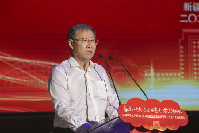 校党委书记葛国发表讲话,他首先代表学校党委向受到表彰的先进集体和个人表示热烈祝贺,并全面回顾了永利官网学生集体和个人在学校党委的坚强领导下,努力奋斗取得优异成绩的青春历程,充分肯定了永利官网广大青年为学校发展所做出的积极贡献,同时对全校广大青年学子提出四点希望:一是听党话、跟党走,做担当民族复兴大任的时代新人。胸怀国家,心系新疆,用内心感应时代脉搏,把对祖国血浓于水的情感贯穿学业全过程,为建设祖国、建设新疆打牢基础;二是树立理想、坚定信念,做勇毅前行的时代先锋。志存高远,向英雄学习、向前辈学习、向榜样学习,在实现中华民族伟大复兴的时代洪流中踔厉奋发、勇毅笃行;三是努力学习、勇于创新,做社会主义事业的开创者和建设者。在实践中成长成才,努力成为知识丰富、眼界开阔、开拓进取的社会主义事业开创者和建设者;四是加强修养、锤炼品德,做良好风尚的传播者和践行者。锤炼品德,矢志追求更有高度、更有境界、更有品位的人生。