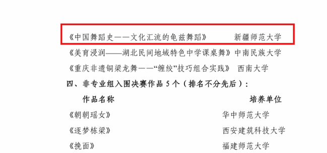 由音乐学院滕莹、肖尧轩两位教师指导、2023级研究生黎莹莹负责的作品《中国舞蹈史——文化汇流的龟兹舞蹈》入围了第一届中国研究生“文化中国”两创大赛(舞蹈赛道)总决赛。