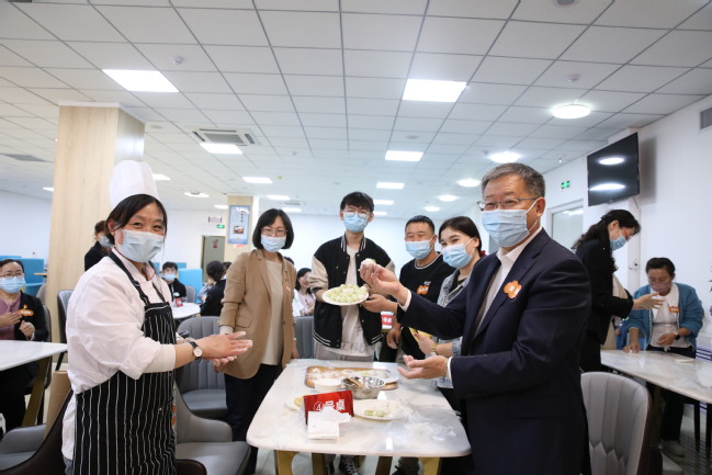 美食也是一种“共情”,它是最能体现一个国家和民族文明特色的文化载体之一。此次主题党日活动,还设置了师生共同制作不同民族传统美食元宵、馓子的实践环节。活动现场一片欢声笑语,师生一起动手,用面团把馅儿包裹住,搓成大大小小的汤圆;拿起面条,用手来回抻开,撑、绷成粗细均匀的馓子条……在相互学习、交流中不仅增进了彼此的了解和友谊,也一同感受到不同民族饮食文化的多元魅力。