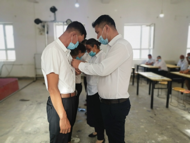 老党员为新党员佩戴党员徽章