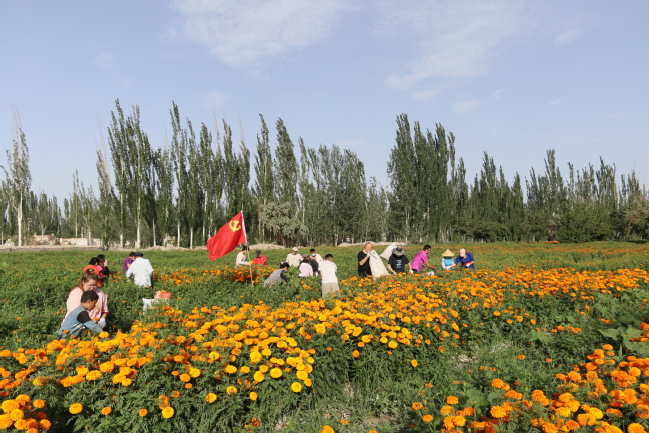 该村村民古荪·扎依提家中缺少劳动力,在今年被识别为脱贫不稳定户。近日,她又因心脏病发作住院,导致种植的1亩万寿菊无法采摘。7月2日下午,村党总支组织全体党员抢收她家的万寿菊,学校“民族团结一家亲”结亲干部和参加暑期实践的师大学生一同劳动,很快就完成了万寿菊采摘工作。“我们结亲过来,能和村民多沟通交流,帮助干一些力所能及的活儿,感觉挺好。”结亲干部赵成喜说。“能在建党100周年的时候,和全村党员一起帮助困难村民采摘万寿菊,这一次的意义有点不一样。”工作队队员赛迪古丽·哈西木笑着说。