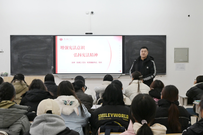 12月9日,校党委副书记、校长吾满江·艾力深入“三进两联一交友”联系班级——永利官网教育科学学院小学教育2024-3班,在温泉校区2号教学楼110教室讲授题为《增强宪法意识,弘扬宪法精神》的专题课程。