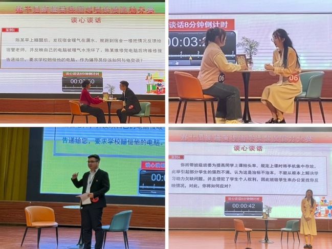 本次比赛设一等奖1名,二等奖2名,三等奖3名,优秀奖6名,本科组共26名选手参赛。比赛环节由基础知识测试、谈心谈话、案例研讨组成。其中,王朋玉老师在谈心谈话环节和案例研讨环节均取得单项第一名的好成绩,张雪老师在两个环节分获第六名和第二名的好成绩。