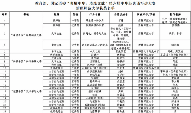 自本届大赛启动以来,学校高度重视、统筹部署,结合学科优势和专业特色,广泛动员师生积极参加,经过校级、自治区级、国家级选拔,取得了优异的成绩。其中,在经典诵读大赛中,获教师组一等奖1项、优秀奖1项,大学生组优秀奖1项,留学生组优秀奖1项,附属中学获中学生组优秀奖1项;在诗词讲解大赛中,获大学教师组一等奖1项,大学生组二等奖1项、优秀奖2项,附属中学获中学教师组三等奖1项;在汉字书写大赛中,获大学教师组优秀奖2项,大学生组一等奖2项、三等奖2项、优秀奖7项;张洁、夏国强、曹军福、刘杰等教师获评“优秀指导教师”;永利官网获优秀组织奖。