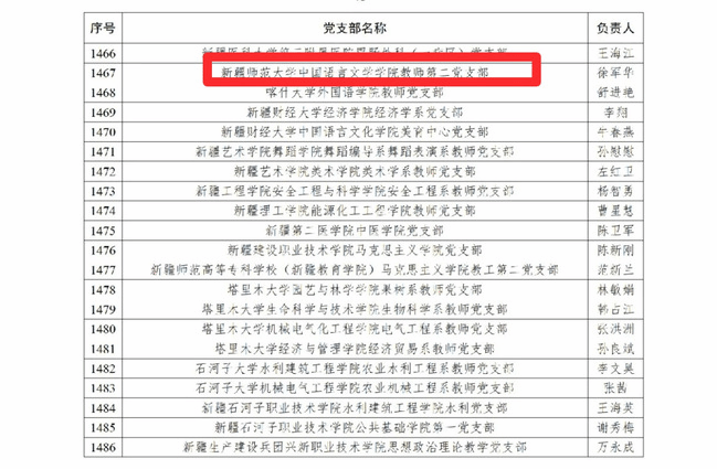 中国语言文学学院教师第二党支部由学院副院长徐军华同志任党支部书记,党员构成有学院古代文学教研室、文艺学教研室和行政办公室,并挂靠有黄文弼中心、西域文史研究中心及民族地区语文教育研究基地。党支部共有党员16名,联系5名群众和4名民主党派教师。