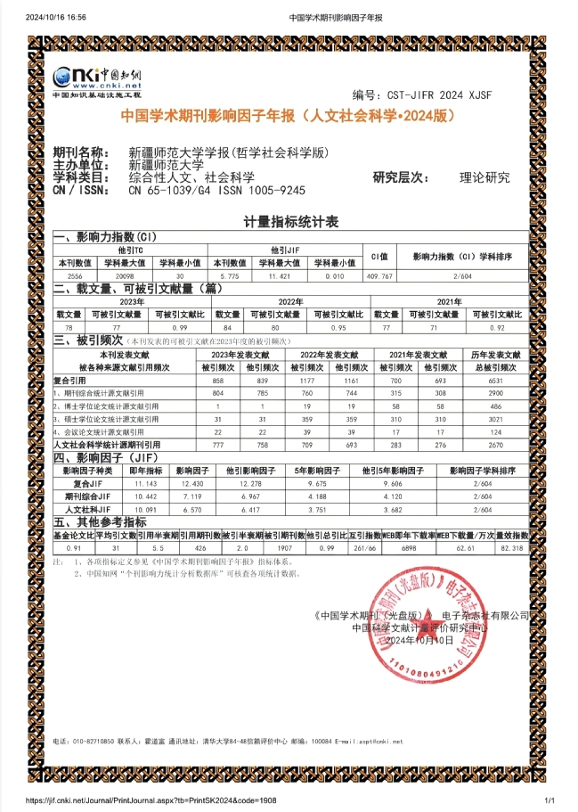10月10日,据中国知网《中国学术期刊影响因子年报(人文社会科学·2024版)》数据显示,《yl6809永利官网学报(哲学社会科学版)》复合影响因子、复合即年指标均位列全国高校综合性人文、社会科学学报第一名。