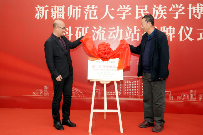 在全场师生的见证下,吾满江·艾力和崔延虎教授共同为民族学博士后科研流动站揭牌。