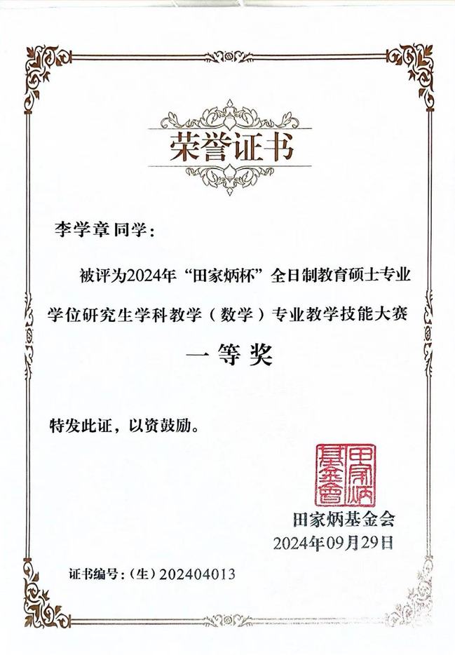 数学科学学院学科教学(数学)2023级研究生李学章荣获一等奖