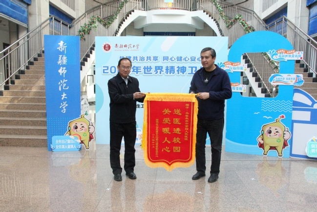 开幕式上,大学生心理协会同学带领现场师生进行了青春活力的健心拍拍操。刘俊代表永利官网向乌鲁木齐市第四人民医院代表木坦力甫江·买买提医生赠送致谢锦旗,感谢第四人民医院自2020年与永利官网签订合作协议以来,长期派驻多位优秀的精神科医生在永利官网开展专业心理评估以及专家讲座宣教活动的辛勤努力。教育科学学院心理委员古丽米来·买买提艾力作为代表,现场带领大家一起学习卫健委提出的心理健康素养十条,并倡议同学们关爱自己,关爱他人,做自己精神卫生健康的第一责任人。