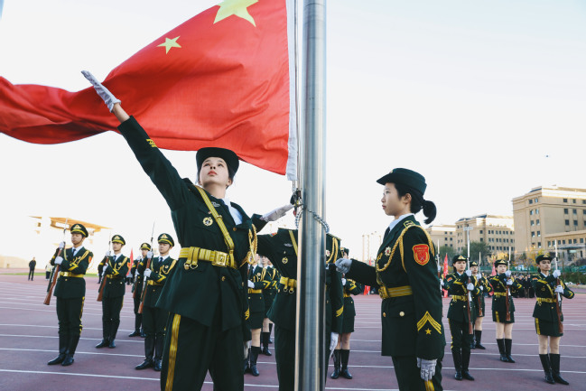 全体在家校领导,各部门、各学院党员干部和师生员工等6000余人参加了升旗仪式。
