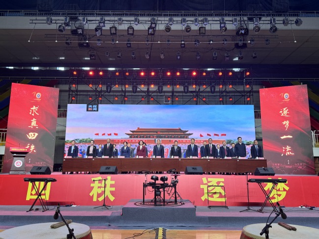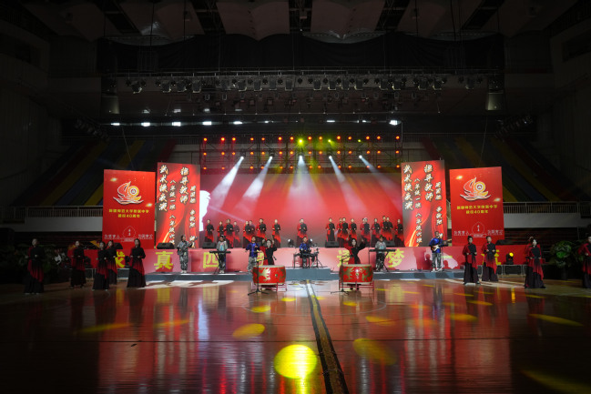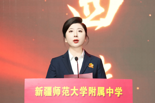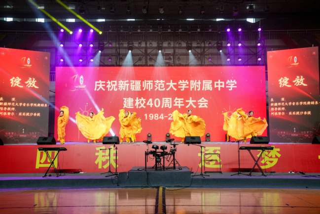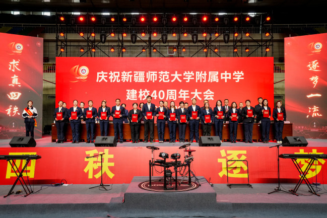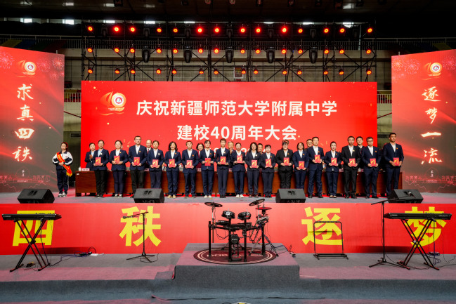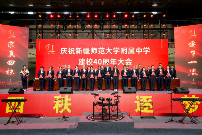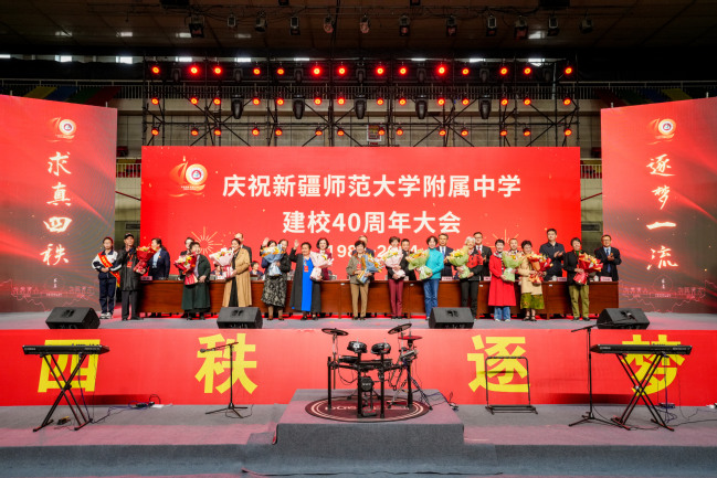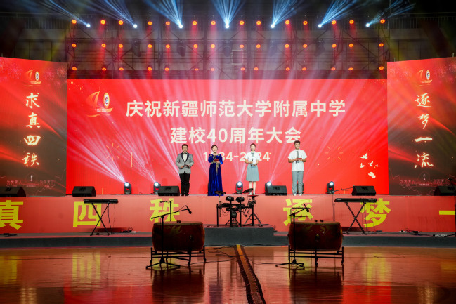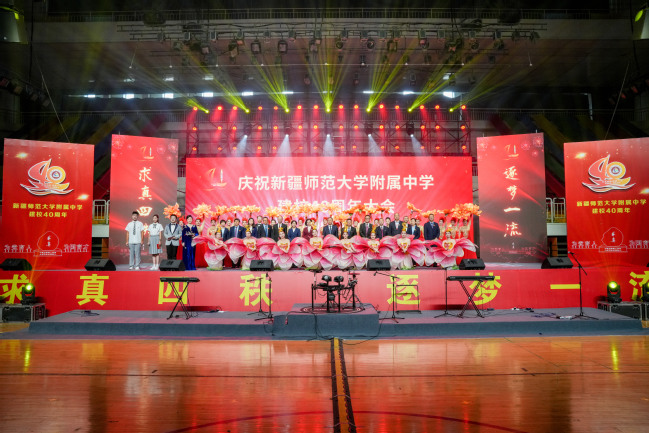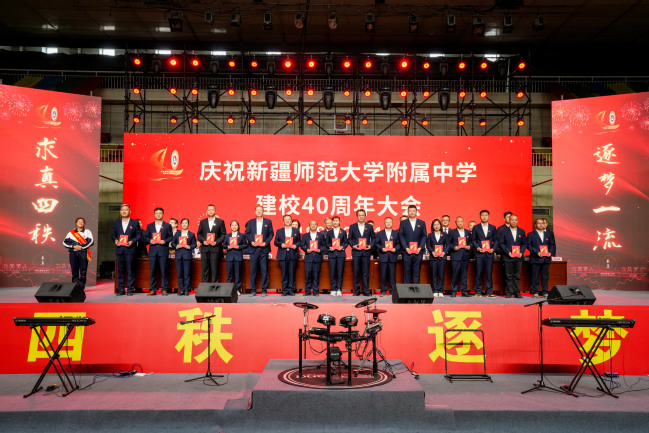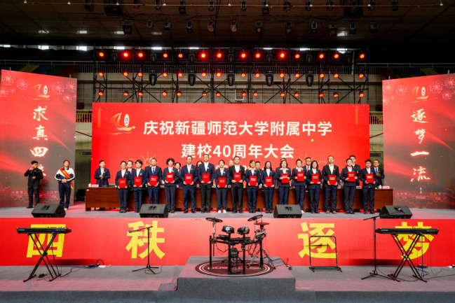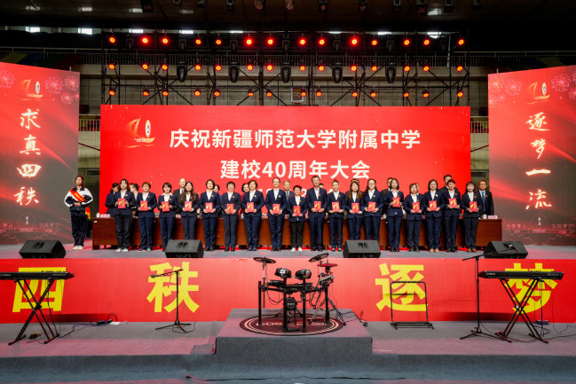 校党委书记葛国在致辞中指出,四十年来附属中学在党的坚强领导下图强奋进,攻坚克难,不忘办学之艰辛,牢记办学之使命,经过一代代附中人默默耕耘、接续奋斗,用智慧和汗水实现了一次又一次跨越式的发展,凝练了附中“千教万教教人求真,千学万学学做真人”的求真校训,形成了“勤业、敬业、追求卓越”的优良校风,打造了“一校两地七区”的教学格局,培养了各行各业一大批栋梁之材,赢得了社会各界的广泛赞誉。葛国强调,站在四十周年新的起点,希望附属中学聚焦“实验性、示范性、有特色、高质量”办学目标,努力成为首府乃至新疆基础教育发展的排头兵;希望广大教师争当“四有”好老师,努力成为塑造学生的“大先生”;希望附属中学广大学子树立远大的目标,立志做有理想、敢担当、能吃苦、肯奋斗的新时代好青年。