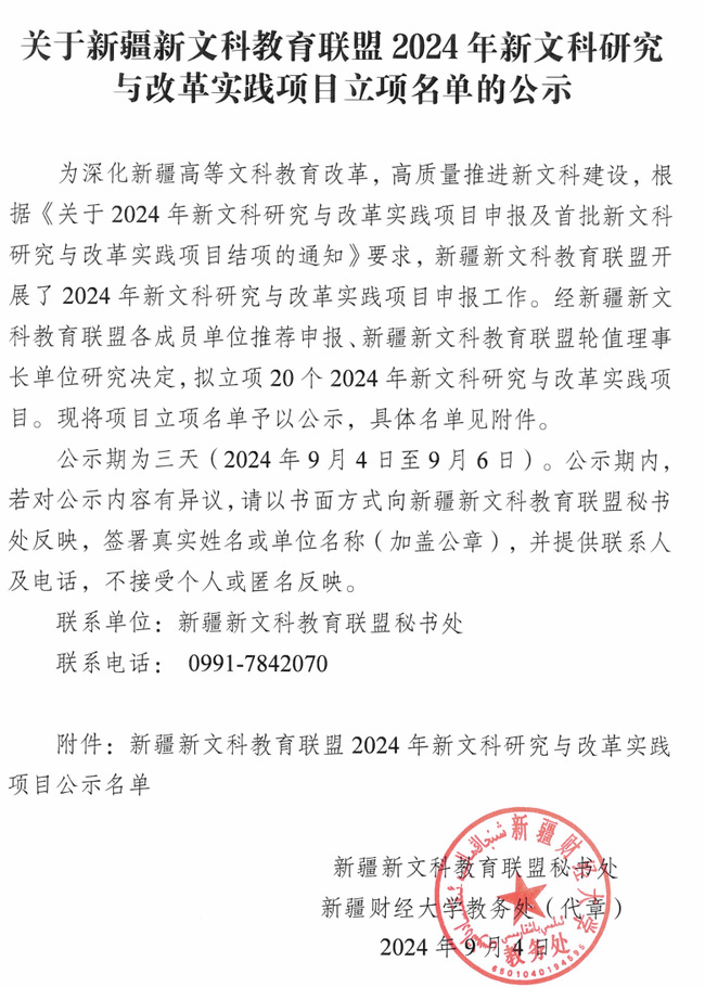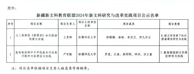 近日,新疆新文科教育联盟公布了《关于新疆新文科教育联盟2024年新文科研究与改革实践项目立项名单的公示》,永利官网王勇辉、严学勤2位教师成功立项新疆新文科教育联盟2024年新文科研究与改革实践项目。