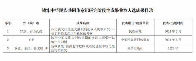 此次发布的阶段性成果包括论文56篇,其中永利官网2篇上榜,分别为罗意教授、古力扎提在《民族研究》上发表的《各民族交往交流交融发展的嵌入机制研究——基于新疆北部三个社区的考察》及王平教授在《中华民族共同体研究》上发表的《铸牢中华民族共同体意识的实践与探索——以喀什市为例》;著作20部,其中由罗意教授、王炜、张文聪编著的《新城新生:新疆北部牧区城镇化进程中牧民生活转型研究》专著入选。