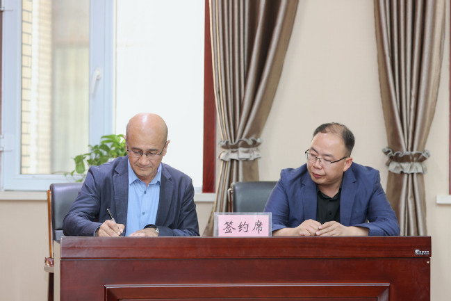 校党委副书记、校长吾满江·艾力代表学校与历史与社会学院白海提教授现场签订岗位聘用书