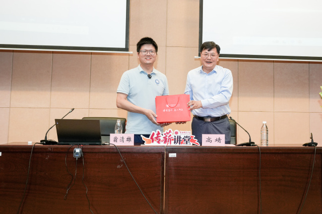 高靖在总结中感谢翁清雄教授带来的精彩内容,既为授课教师梳理了理论脉络,又多角度的拓展了学生的就业思维。最后,高靖代表学校向翁清雄教授赠送了“新师礼物”。