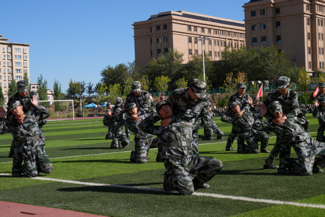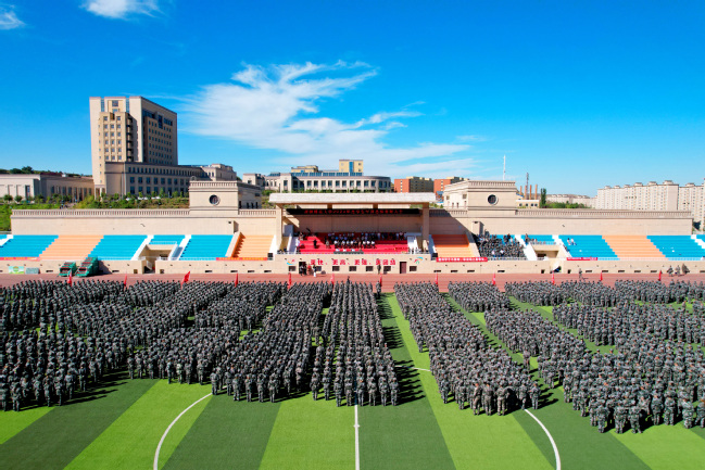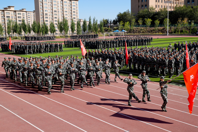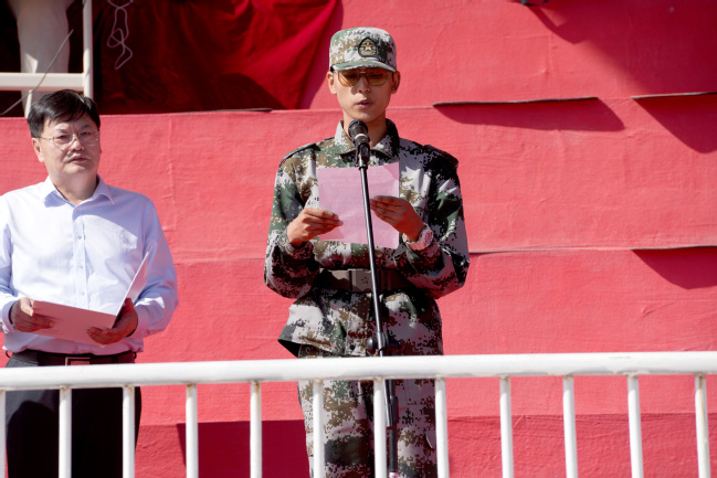 王志勇、刘俊分别在两校区作总结讲话,代表校党委对承担此次军训任务的武警新疆总队机动第一支队的全体教官和学校退役大学生教官表示衷心的感谢,对参训学生吃苦耐劳、锐意进取、奋勇拼搏的精神给予了高度赞扬,同时对同学们经过十三天的艰苦训练取得的丰硕成果表示了肯定。希望全体同学能继续巩固和发扬军训历练的顽强意志、良好品德和优良作风,脚踏实地,顽强拼搏,将青春奋斗融入党和人民的伟大事业,做让党和人民放心的强国一代,为实现中华民族伟大复兴贡献青春力量。
