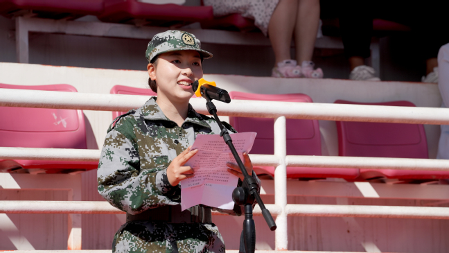 生命科学学院生物工程23-6班阿尔兰·卡力木汉、化学化工学院化学23-3班伍属映作为军训学生代表发言。