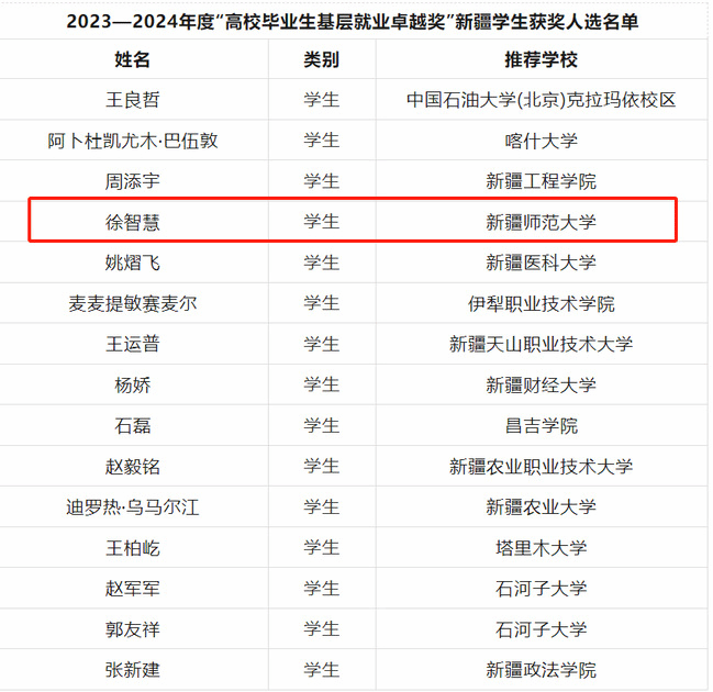 近日,中国教育发展基金会公布2023-2024年度“高校毕业生基层就业卓越奖”获奖人选名单。永利官网中国语言文学学院2016届毕业生徐智慧获此殊荣,成为全疆15名获奖者之一。