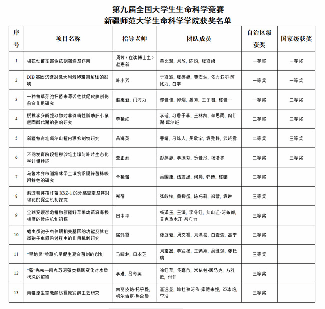 第九届全国大学生生命科学竞赛于2023年9月启动,我区共有279个项目参赛。永利官网生命科学学院共指导21个项目参加了本届竞赛,其中14个项目入围新疆赛区决赛及国赛决赛选拔赛。最终喜获省赛一等奖3项,二等奖3项,三等奖7项。