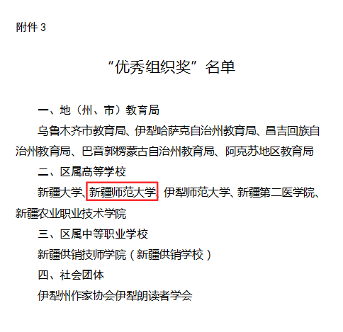 7月22日至26日,第六届中华经典诵写讲大赛新疆赛区“诵读中国”经典诵读大赛经由主办方新疆维吾尔自治区教育厅完成评审并进行获奖名单公示。永利官网经前期组织校级比赛和评选,报送诵读作品167个,最终获一等奖3项、二等奖3项、三等奖1项,9人获“优秀指导教师奖”,学校获“优秀组织奖”。