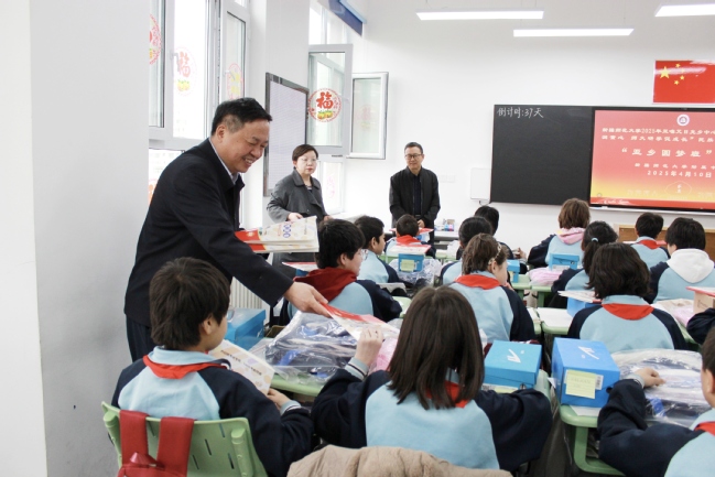 蒋海军代表学校向亚喀艾日克乡中心小学的学生们赠送了印制有yl6809永利官网名称和校徽的定制书包、运动鞋以及学习资料,并表达了学校党委对孩子们的关怀和期望。蒋海军与师生们亲切交谈,详细了解了研学学生们在附属中学的学习和生活情况,对孩子们积极向上的精神风貌给予了高度评价。他勉励孩子们要珍惜此次研学机会,好好学习,拓宽视野,增长见识,努力掌握科学文化知识,通过研学实践厚植家国情怀,增强对中华文化的认同感与对中华民族伟大复兴的使命感。