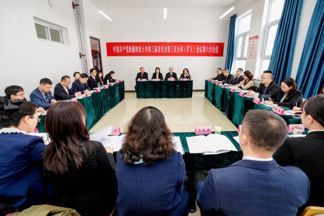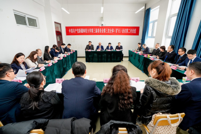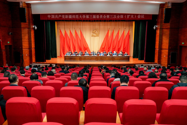 会上,校党委书记蒋海军代表中国共产党新疆师范大学第三届委员会作了题为《坚定信心 振奋精神 抢抓机遇 笃行实干 全力以赴推进新时代高水平师范大学建设》的工作报告。校党委副书记、校长吾满江·艾力主持会议。会议审议通过了《中共新疆师范大学第三届委员会第三次全体(扩大)会议决议(草案)》。