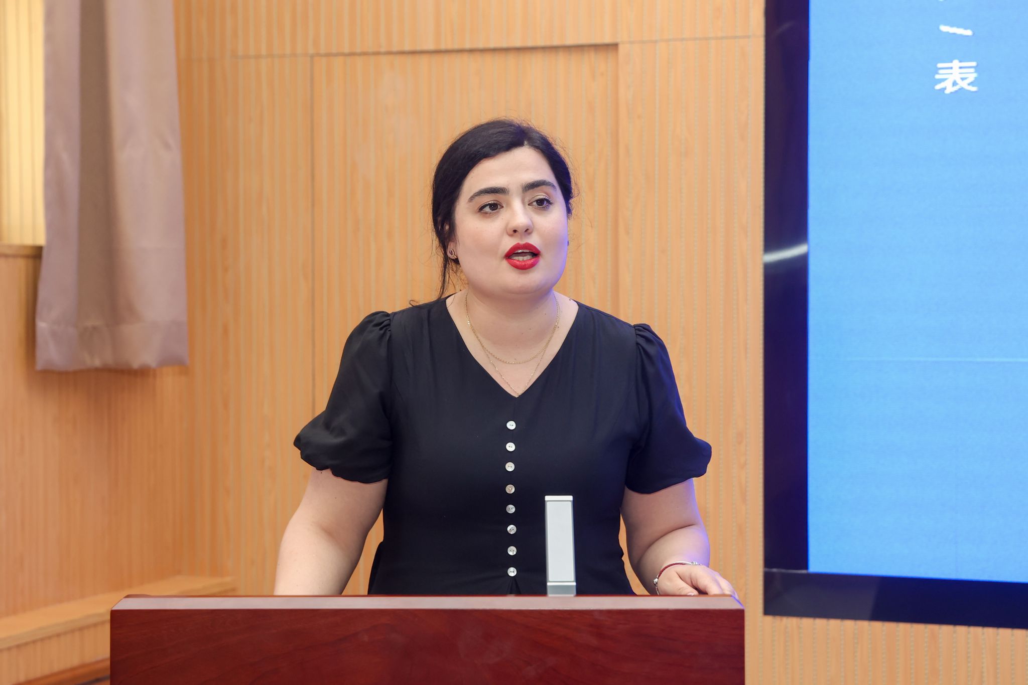 来自塔吉克斯坦的教师刘星雨(HISORIEVA SITORA)代表学员发言。她表示,从教14年,她深刻地感受到中国成语所说的“教学相长”,如今各种事物层出不穷,不断学习和更新知识结构就显得尤为重要。她期待着能通过本期研修班,学习和掌握数智化发展在教学中的最新前沿应用。