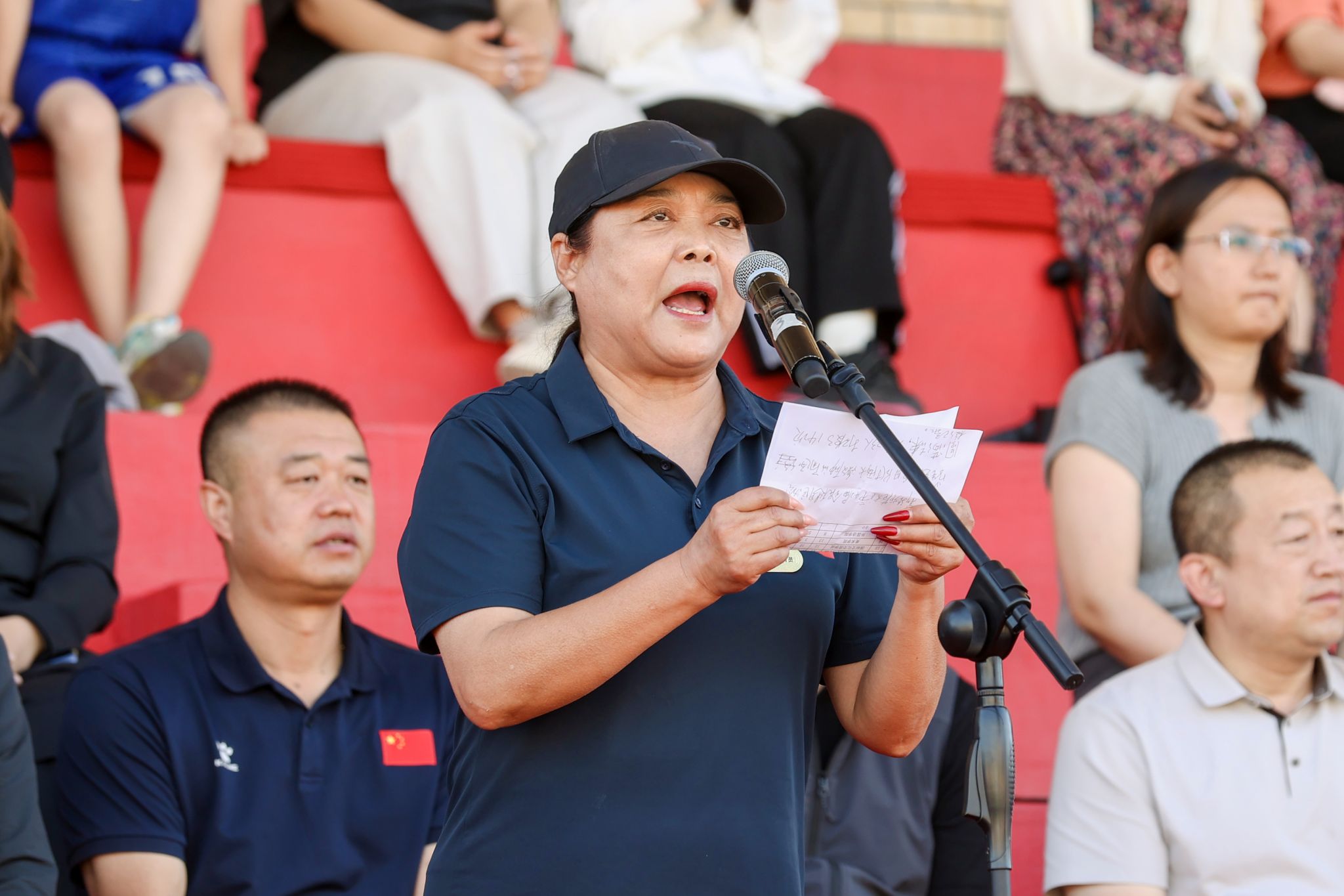 本届运动会总裁判长鲍晓玲宣布田径竞赛项目比赛成绩
