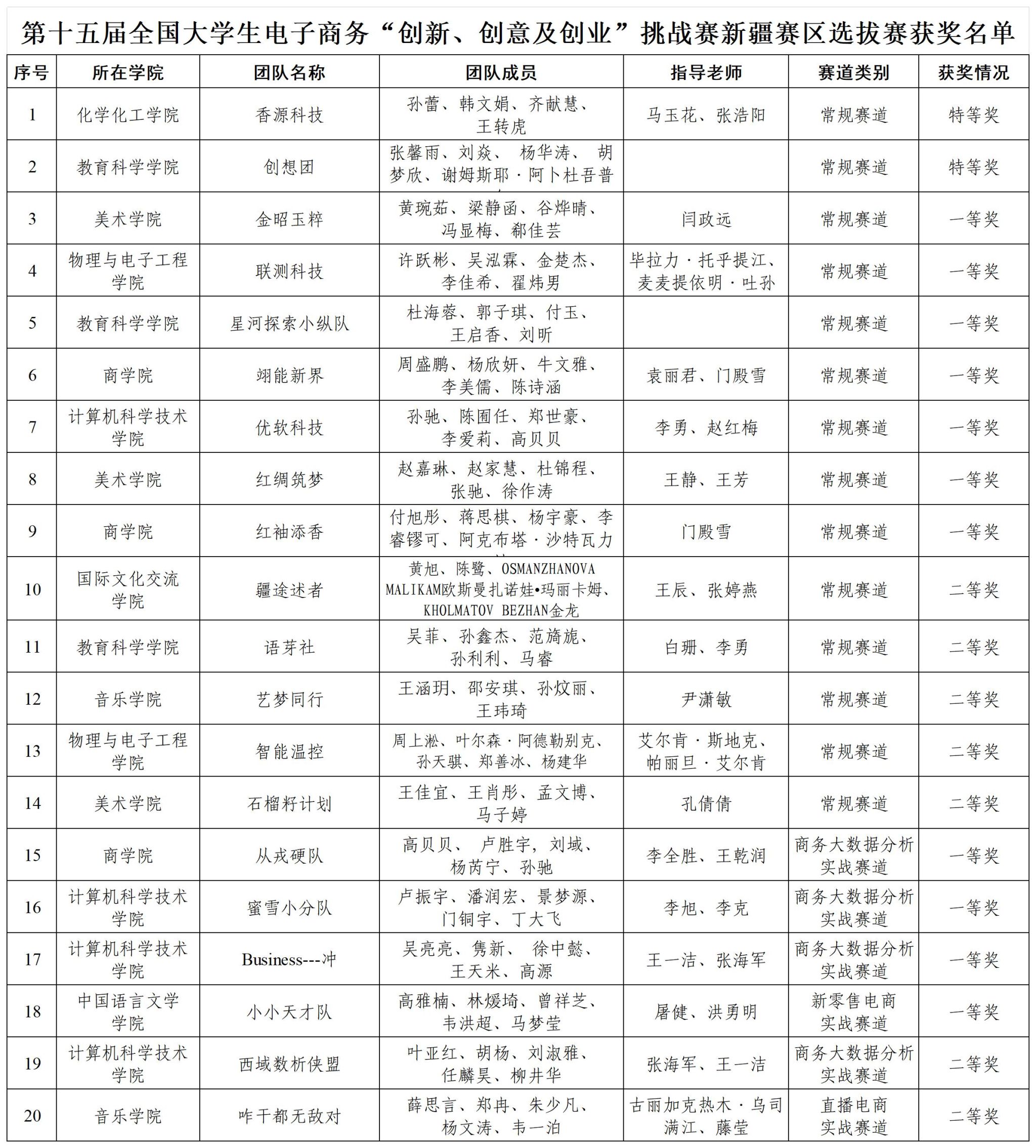 第十五届全国大学生电子商务“创新、创意及创业”挑战赛新疆赛区选拔赛获奖名单