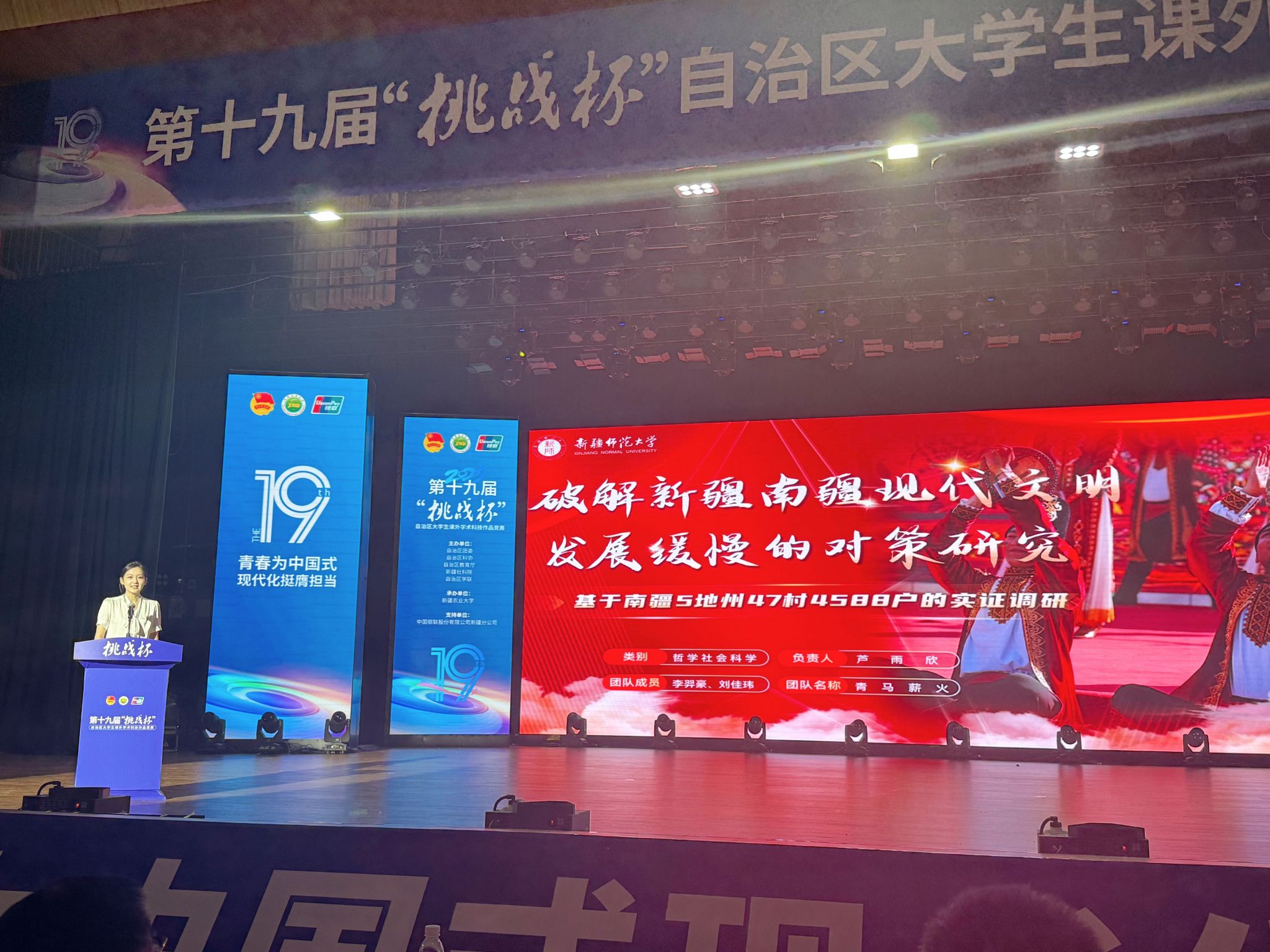 闭幕式上,永利官网特等奖作品《破解新疆南疆现代文明发展缓慢的对策研究——基于南疆5地州47村4588户的实证调研》作为特等奖获奖作品代表进行了现场交流展示。团队成员以生动的语言、详实的数据和精彩的案例,向与会人员介绍了作品的创作背景、研究过程和主要成果,赢得了现场观众的阵阵掌声。此次展示不仅展示了永利官网学子的风采,也为其他高校师生提供了学习和交流的机会。