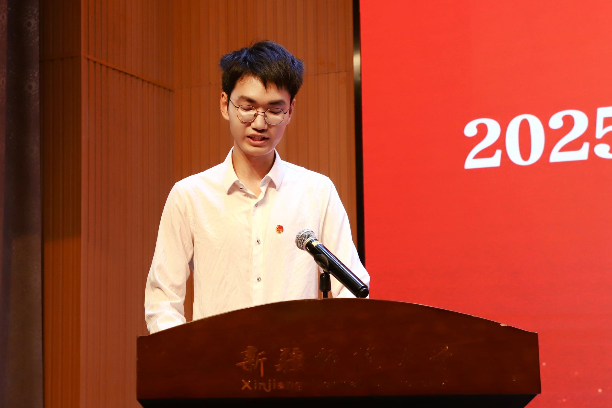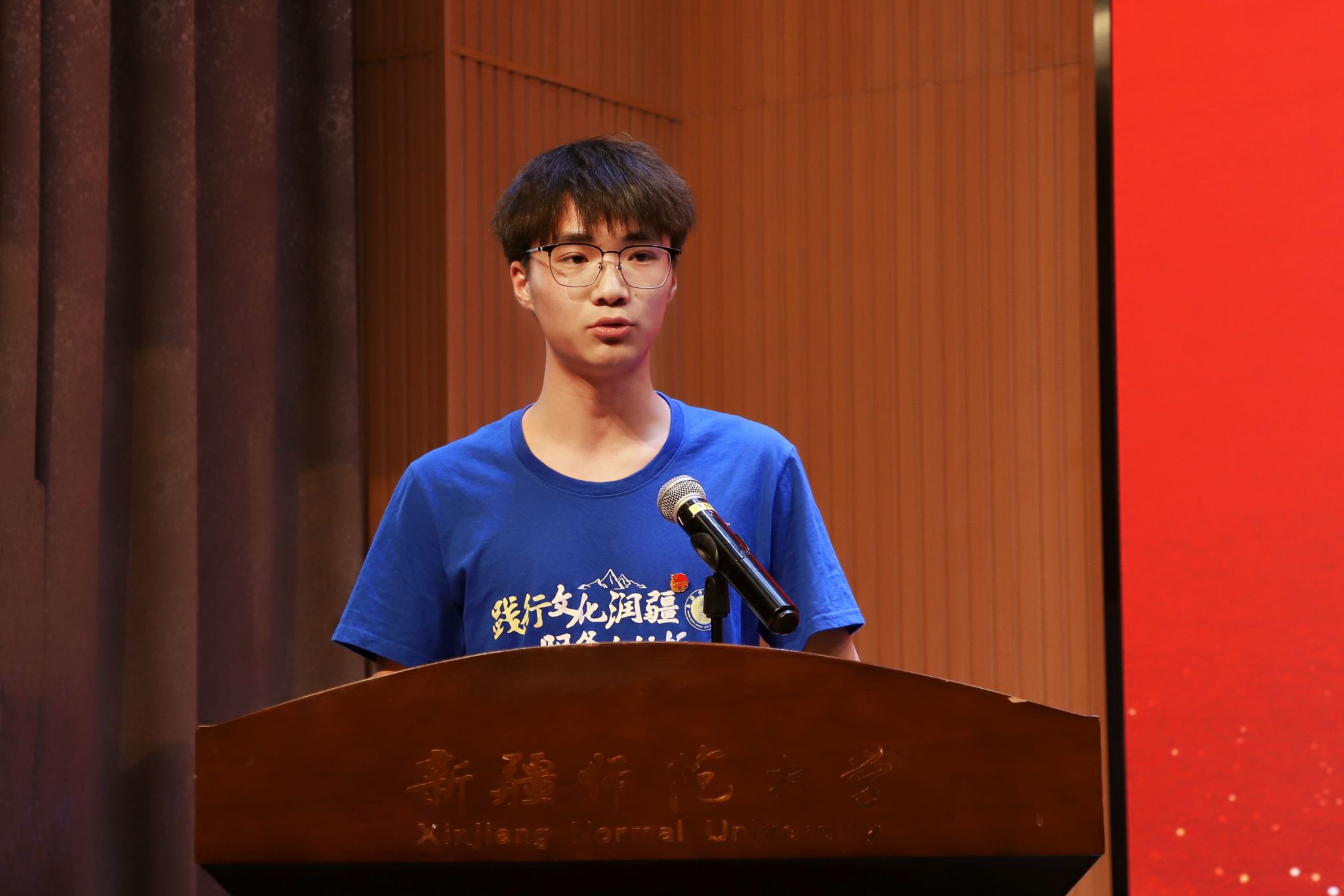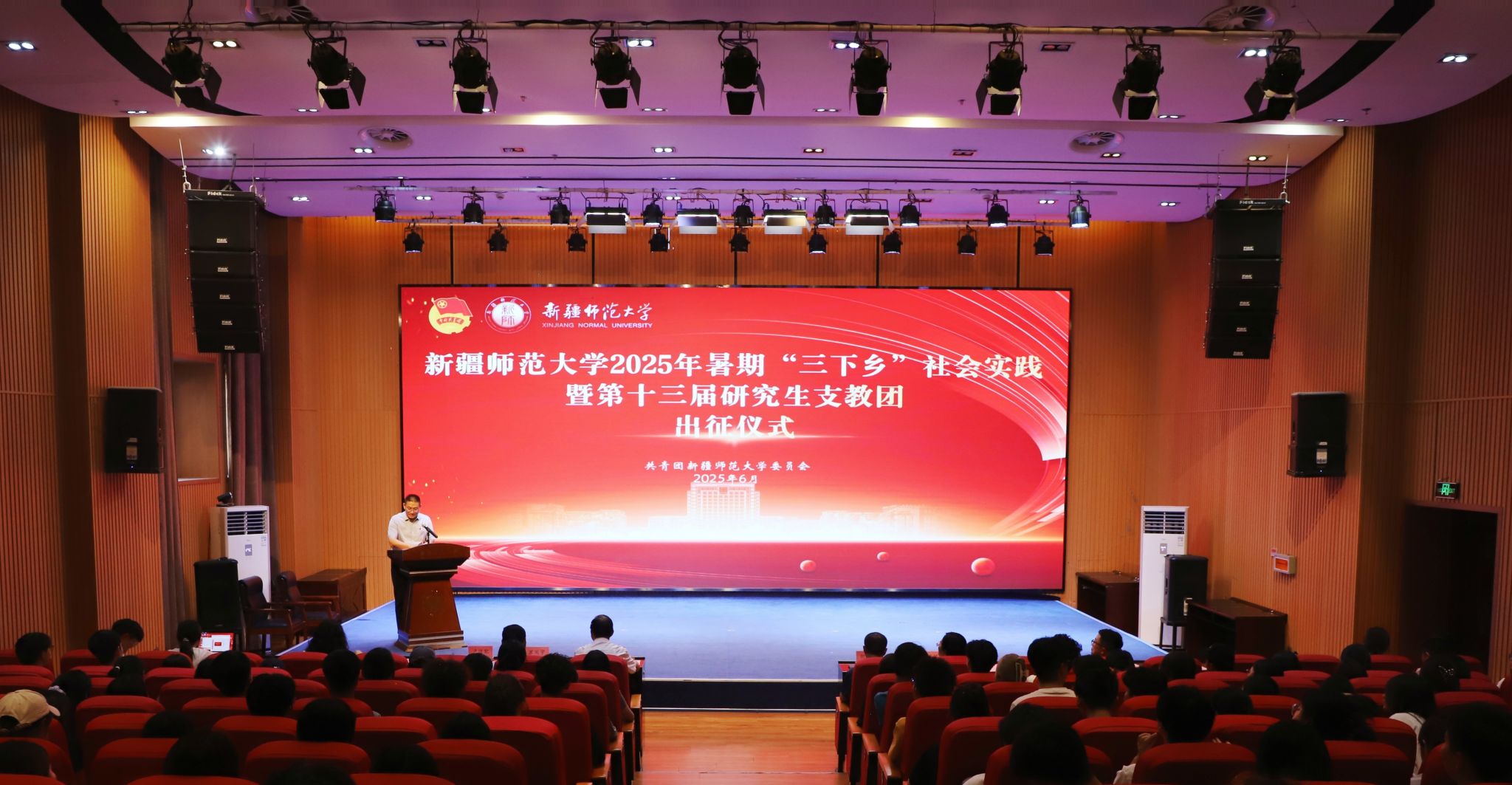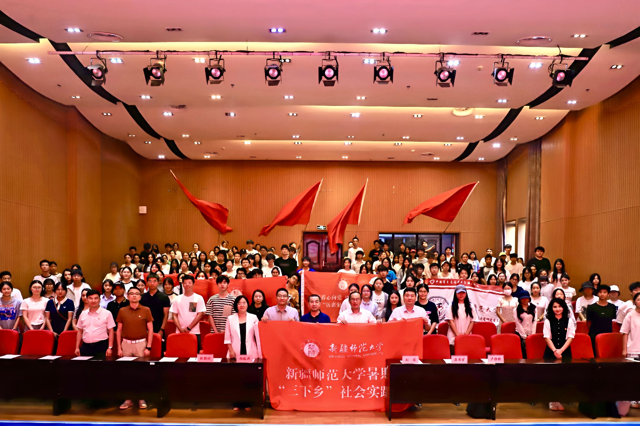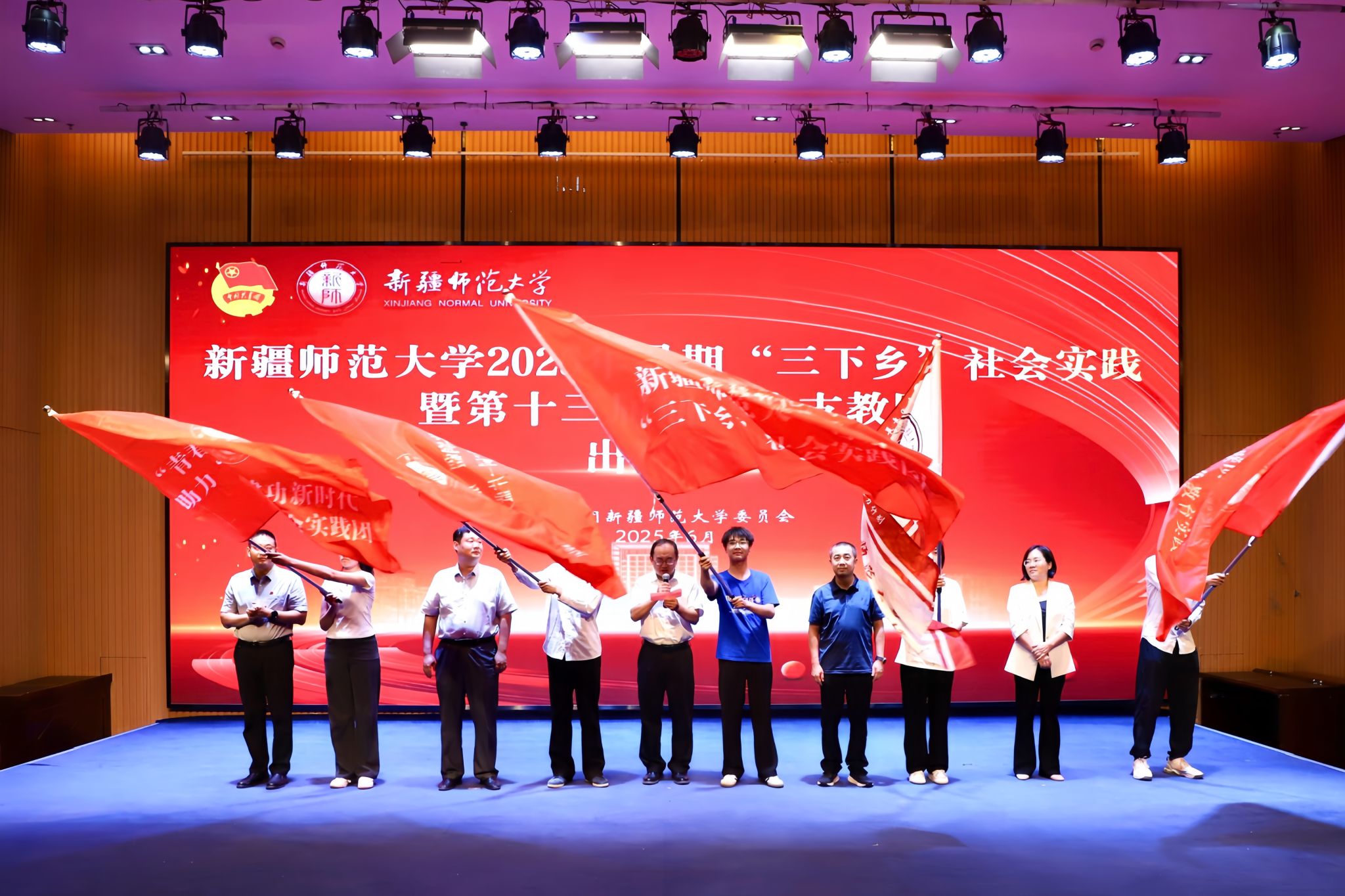 卢修配详细介绍了本年度暑期社会实践的组织规模、重点方向及保障措施;生命科学学院团委书记苏日耶姆·尼加提承诺将全力护航学生实践,指导青年在田野乡间书写科研报国新篇;第十三届研究生支教团成员、历史与社会学院包薇儿同学誓言传承奉献精神,用知识与爱心点亮边疆孩子的梦想;校级重点团队代表、校青年志愿者协会负责人任泽函同学代表“同一片蓝天下”教育实践团,表达了促进教育公平、传递温暖的坚定决心;马克思主义学院罗瑞泽同学作为“红色教育实践课堂”代表,立志深挖红色资源,让革命精神在新时代绽放光芒。随后,参会领导共同为即将出征的实践团队授旗。