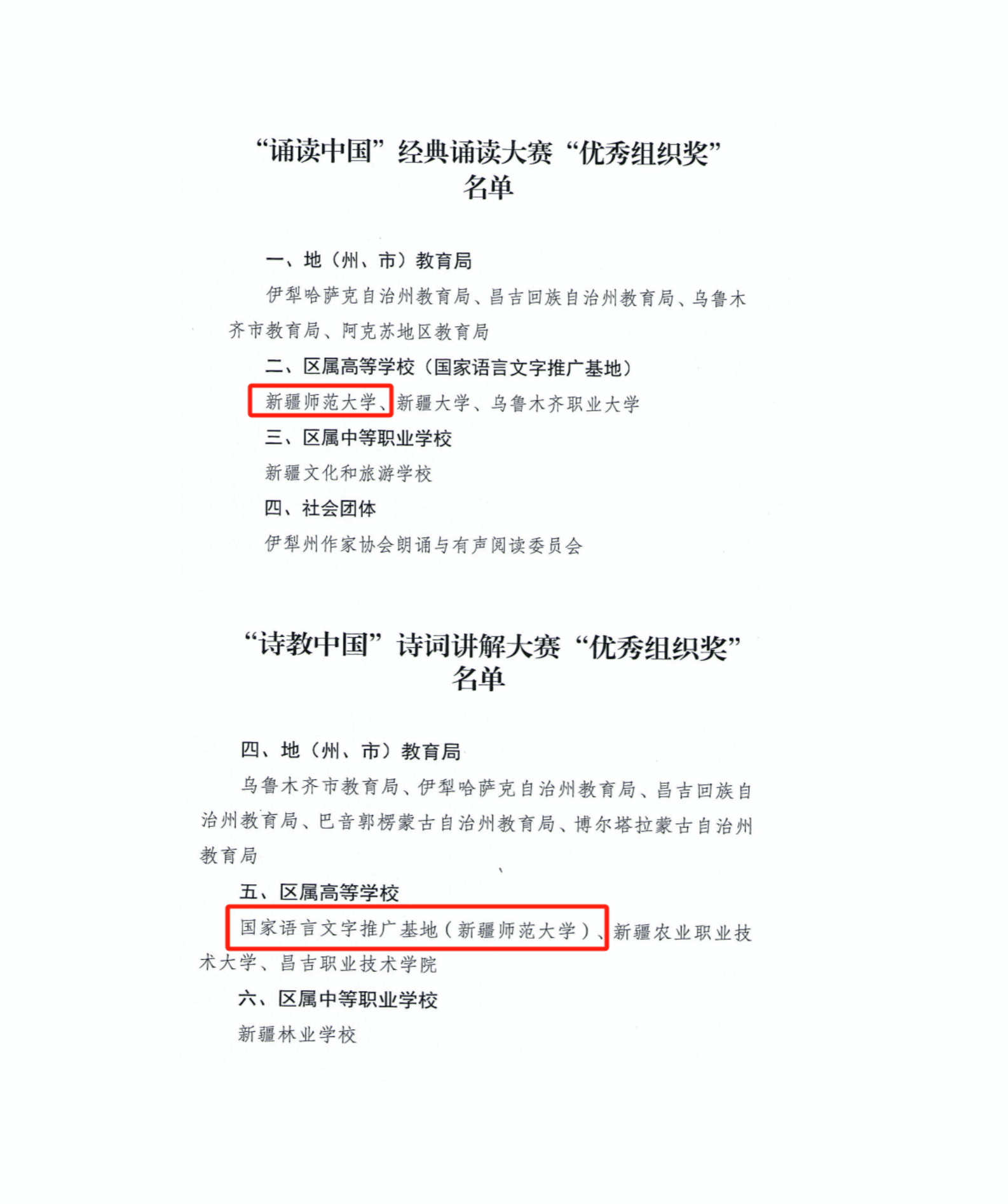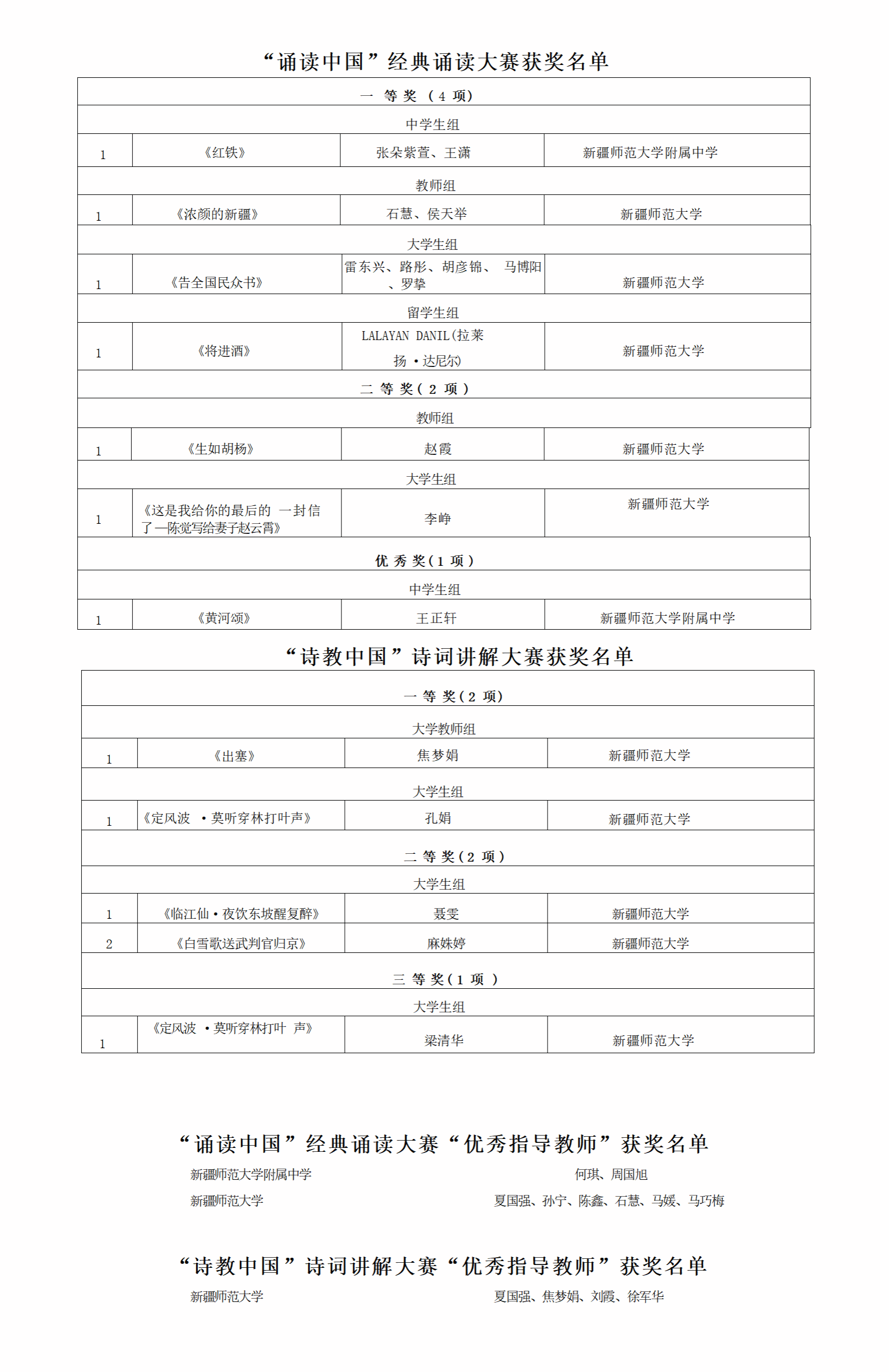近日,第七届中华经典诵写讲大赛新疆赛区“诵读中国”经典诵读大赛及“诗教中国”诗词讲解大赛获奖名单经由主办方新疆维吾尔自治区教育厅完成评审并公示,永利官网经前期组织校级比赛和评选,报送作品120个,最终获一等奖6项、二等奖4项、三等奖1项,优秀奖1项,以上获奖作品将继续参与第七届中华经典诵写讲大赛全国复赛的激烈角逐。夏国强等获“优秀指导教师奖”,学校分获两类比赛“优秀组织奖”。
