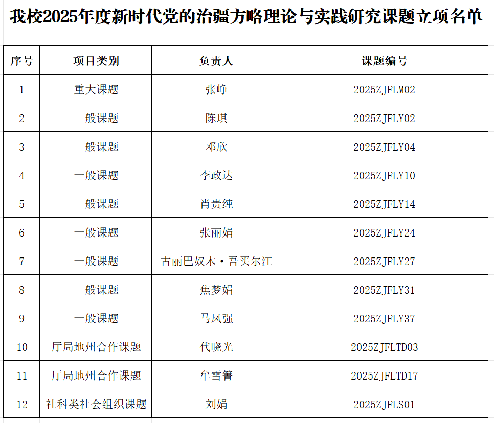 近日,自治区社科联公布了2025年度新时代党的治疆方略理论与实践研究课题立项名单,永利官网立项12项,其中重大项目1项、一般项目8项、厅局地州合作项目2项、社科类社会组织课题1项。
