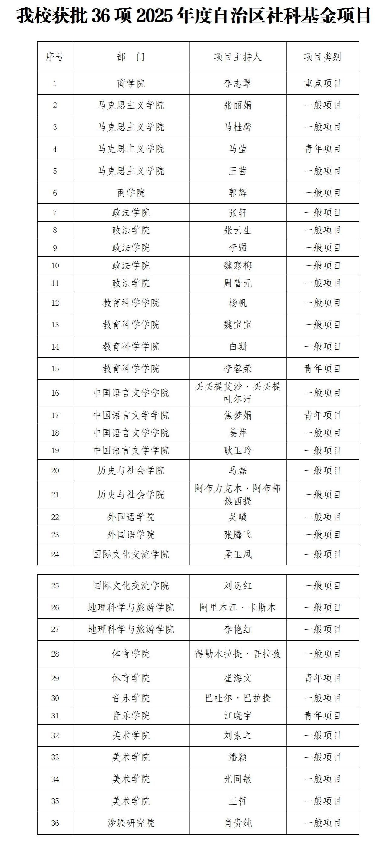 此次立项的36个项目涵盖了马列·科社、教育学、语言学、应用经济、中国文学、体育学、艺术学等多个学科领域,内容涉及新疆社会稳定与长治久安、教育高质量发展、文化传承与创新等重大课题。这些项目的研究开展,不仅将进一步提升永利官网的科研水平和学术影响力,还将为自治区的经济社会发展提供有力的智力支持和决策参考。
