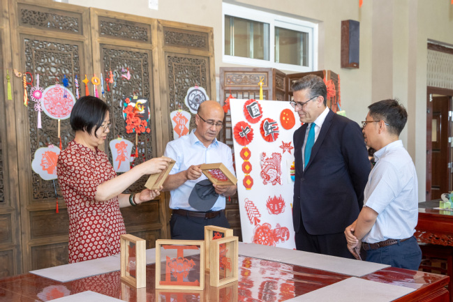座谈前,吾满江·艾力、王世杰陪同卡里尔·哈什米大使一行参观了美育浸润实践基地。自治区外办新闻文化处处长、自治区人民对外友好协会办公室主任顾玫陪同访问。
