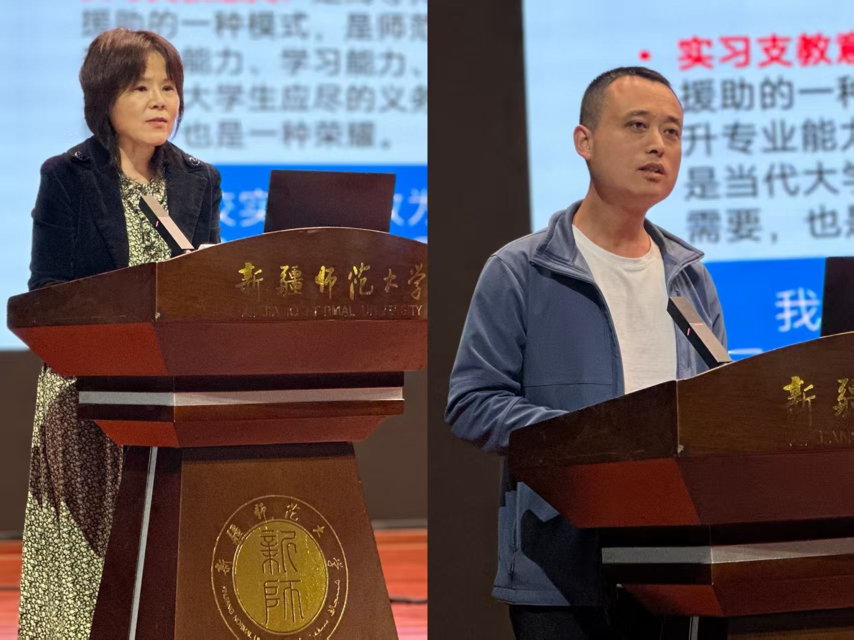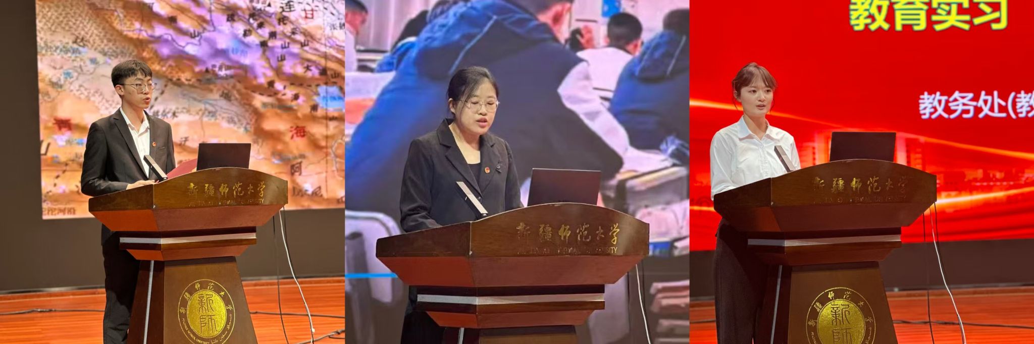 教育科学学院教育学22-1班包振飞、化学化工学院化学22-1班吴亚彤作为往届实习学生代表,讲述了他们在支教过程中的成长收获与感人故事,激励新一届实习生勇于担当、积极作为。马克思主义学院思想政治教育23-3班麦日排提·库热西代表即将奔赴各地州的实习生庄严承诺:将牢记校训精神,恪守教师职责,不负学校重托,圆满完成实习支教各项任务。