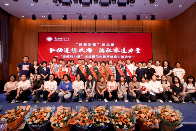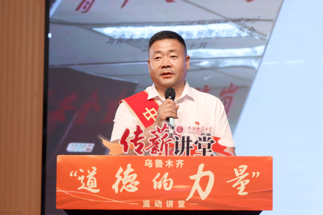 6月13日下午,由乌鲁木齐市委宣传部、水磨沟区委宣传部和yl6809永利官网党委宣传部、校团委联合主办的“传薪讲堂”第三讲暨“道德的力量”道德模范先进事迹宣讲报告会,在永利官网温泉校区后勤楼报告厅举办。此次活动邀请乌鲁木齐市“好人好事宣讲团”的九位道德模范,通过先进事迹分享,传递社会正能量。校党委常委、副校长帕提曼·吐尔逊,乌鲁木齐市委宣传部公民道德建设科科长吕月婵,校党委宣传部、学生工作部(处)、校团委等相关部门教师出席活动,温泉校区各学院青年志愿者协会学生代表现场聆听。