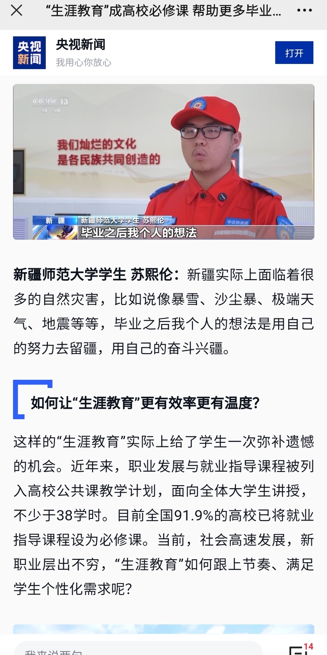 苏熙伦以“国际救援队联络官”为职业目标,以“我有一个玫瑰红色的梦”为题,聚焦翻译专业助力、救援能力保障、志愿服务大美新疆等内容,以习近平总书记关于救援力量建设的要求开篇,从梦想播种、梦想发芽、梦想开花、梦想结果四个阶段呈现了自己成为救援队员的成长与行动。比赛前后,苏熙伦分别接受了中央广播电视总台新闻频道等多家媒体采访,央视新闻客户端刊发了相关报道。