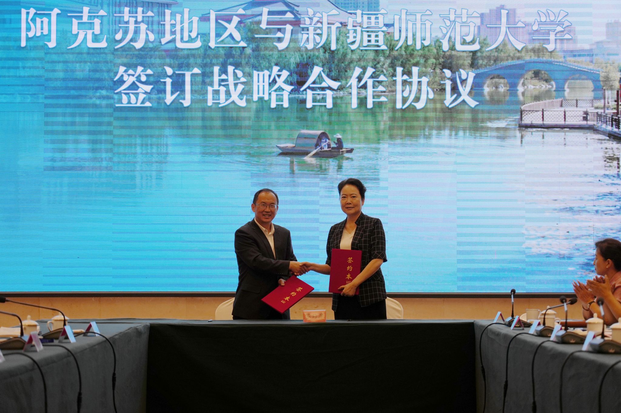 座谈会上,校党委副书记刘俊与阿克苏地区行署副专员王新春共同签订战略合作框架协议。双方参会人员还围绕学生就业实践、科技成果转化等方面进行了深入探讨。