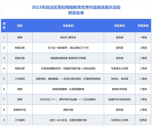 近日,在自治区党委教育工委、网信办举办的2023年自治区大学生网络文化节和自治区高校网络教育优秀作品推选展示活动中,永利官网师生共有49件作品获奖。其中,一等奖7项、二等奖17项、三等奖12项、优秀奖13项。