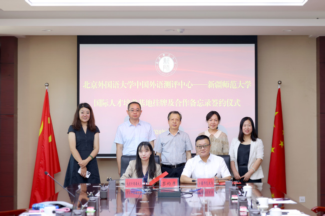 冯涛和陈彤代表双方进行国际人才培养基地签约,孙有中和陈彤代表双方为国际人才英语考试考点单位揭牌。