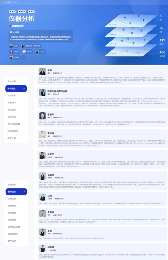 近日,由校党委常委、副校长,新疆天山职业技术大学党委书记关明教授带领自治区“天山英才”教育教学名师工作室团队成员精心打造的《仪器分析》课程知识图谱,正式上线智慧树网。这是永利官网推出的首门AI数智共享课,也是西部地区高校首门《仪器分析》AI数智共享课,不仅标志着永利官网在推进人工智能与教育教学深度融合方面迈出了坚实步伐,是科研反哺教学的重要举措,也预示着传统教学模式将迎来新的机遇和挑战。