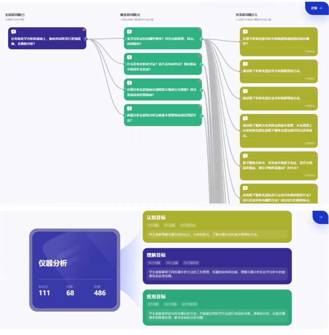 通过此次建设研讨,课程团队认识到《仪器分析》AI数智共享课不仅是传授知识的工具,更是培养学生创新意识和终身学习能力的平台。为此,课程设计中不仅融入了大量的案例分析、研究项目和跨学科学习模块,更是开拓了问题图谱和能力图谱板块,梳理了课程相关的核心高价值问题4个,构建包含疑难复杂问题、组合问题和基本问题共63个的问题体系,同步对标专业人才培养方案及课程标准,构建认知目标、理解目标和应用目标三层能力体系,并由问题体系作为连接桥梁,打通能力—问题—知识—资源四维知识图谱架构,鼓励学生主动探索,勇于创新。