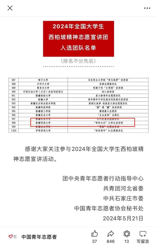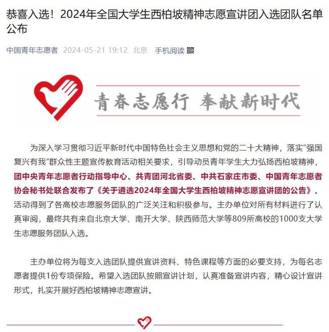 为深入学习贯彻习近平新时代中国特色社会主义思想和党的二十大精神,落实“强国复兴有我”群众性主题宣传教育活动相关要求,引导动员青年学生大力弘扬西柏坡精神,团中央青年志愿者行动指导中心、共青团河北省委、中共石家庄市委、中国青年志愿者协会秘书处联合发布了《关于遴选2024年全国大学生西柏坡精神志愿宣讲团的公告》。活动得到了各高校志愿服务团队的广泛关注和积极参与。主办单位对所有材料进行了认真审阅,最终共有来自北京大学、南开大学、陕西师范大学等809所高校的1000支大学生志愿服务团队入选。其中,永利官网商学院“学岭云杉”大学生宣讲团成功入选2024年全国大学生西柏坡精神志愿宣讲团。
