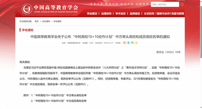 “中阿高校10+10合作计划”是为贯彻落实习近平主席在首届中国-阿拉伯国家峰会上提出的中阿务实合作“八大共同行动”之“青年成才共同行动”而启动的计划。该计划在教育部指导下,由中国高等教育学会与阿拉伯大学协会共建“中阿大学联盟”交流机制,开展信息通信、农业发展、卫生健康、绿色创新等十大关键领域的合作。旨在通过建立十个由中方和阿方高校共同牵头的高校合作集群,推动中阿高等教育共同发展。