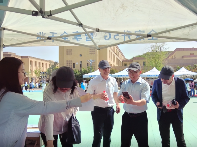 校党委副书记、校长吾满江·艾力,校党委副书记刘俊与义卖工作人员合影