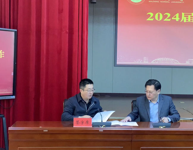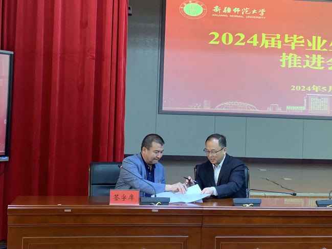 校党委副书记、校长吾满江·艾力出席会议并讲话,会议由校党委副书记刘俊主持。会上,校党委常委、宣传部部长高靖宣读了《yl6809永利官网关于做好2024届毕业生就业创业工作的通知》,历史与社会学院党委书记白丽艳、化学化工学院党委副书记、纪委书记王强华就做好2024届毕业生就业工作作了会议发言。刘俊、高靖分别同美术学院党委书记比拉力江·阿不力孜、中国语言文学学院党委书记陈国栋签订了就业工作目标责任书。