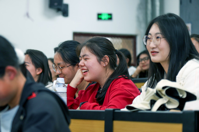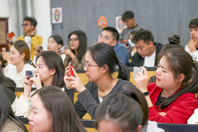 现场观众体验互动环节成为了本次活动的亮点。学生们纷纷穿戴上京剧水袖服饰和头饰,作为“模特”进行京剧服装展示,跟着专业京剧演员学身段,并在专业老师的示范、指导下舞动起长穗剑、双头枪。现场学生们不断地尝试着,与国粹艺术亲密接触。最后,王戈老师带领现场大学生们用京剧念白的方式演绎耳熟能详的古诗词,以当下年轻人最为流行和喜爱的一种学习方式,使大家深深感受到传统文化的魅力。