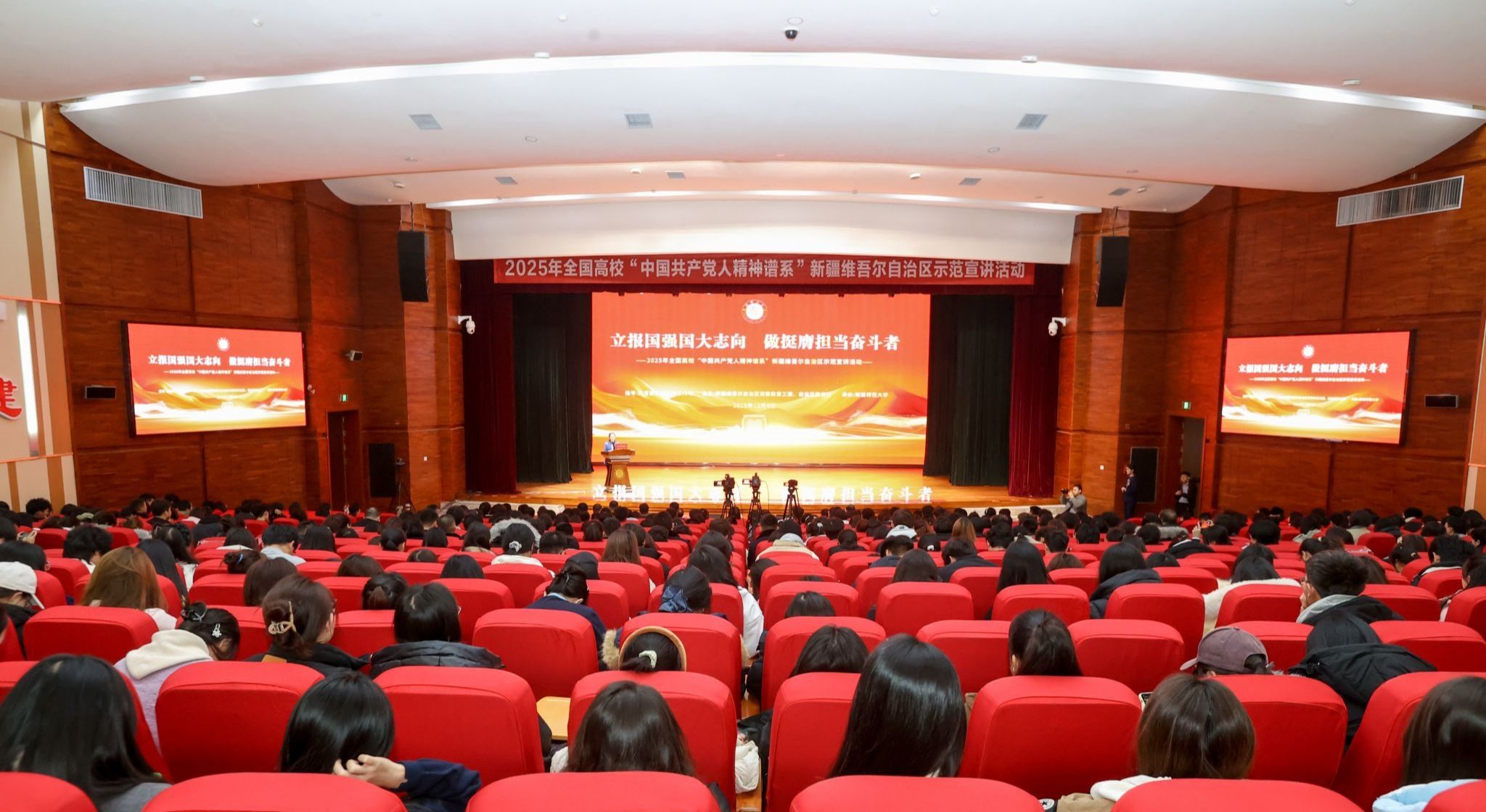 12月4日,2025年全国高校“中国共产党人精神谱系”新疆维吾尔自治区示范宣讲活动在永利官网温泉校区昆仑讲堂举行。活动以“立报国强国大志向,做挺膺担当奋斗者”为主题,采取“线下主会场+线上分会场”的形式开展,乌鲁木齐市高校师生代表及永利官网退役大学生协会、国旗班和各学院学生代表共580余人在主会场参加活动,全区各高校师生同步以视频方式在线聆听宣讲。