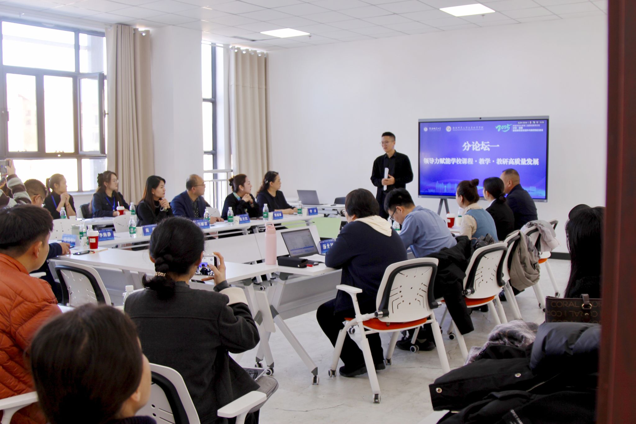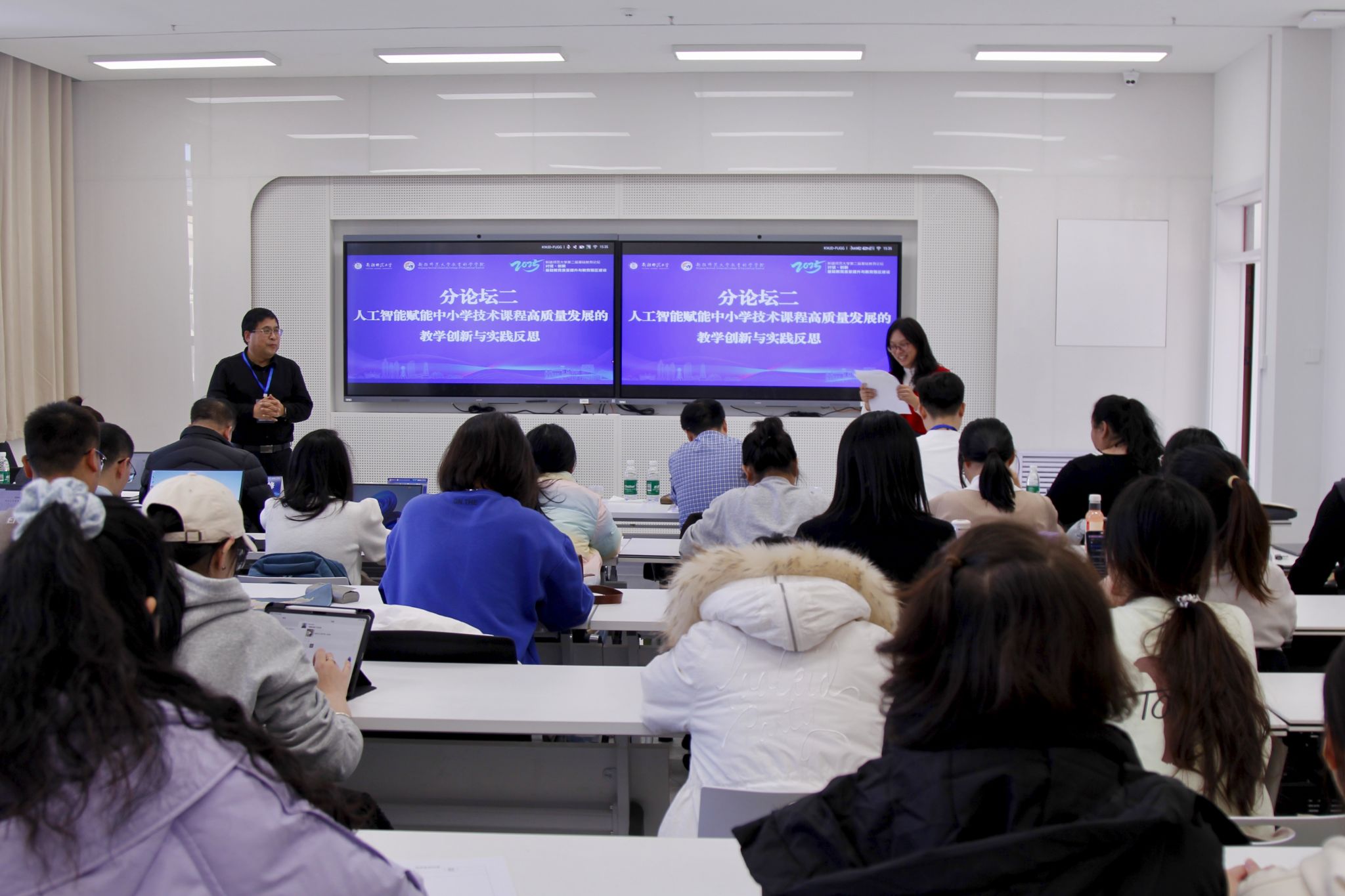 当天下午,五场专题分论坛于文育楼同步举行。与会专家聚焦多个前沿议题展开深度交流,研讨主题涵盖“领导力赋能学校课程·教学·教研高质量发展”“人工智能赋能中小学技术课程高质量发展的教学创新与实践反思”“数智技术赋能小学教学方式变革”“幼儿园课程改革与质量提升的探索与展望”以及“高质量发展背景下特殊教育课程·教师·教学”。现场研讨气氛热烈,展现了理论探索实践创新的深度融合。